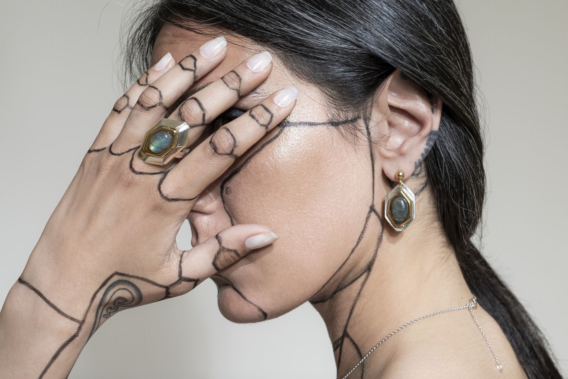 Ispirati dalla fantascienza orientale degli anni ’90; nelle loro forme minimalistiche e con le ampie superfici a specchio, i gioielli di questa collezione mirano, attraverso la labradorite, a ricercare ed alimentare le energie personali. Proprio a questo si rifà la scelta della ripetizione dell’elemento centrale, il fulcro, in bronzo che racchiude la pietra, come a proteggerla ed esaltarla.